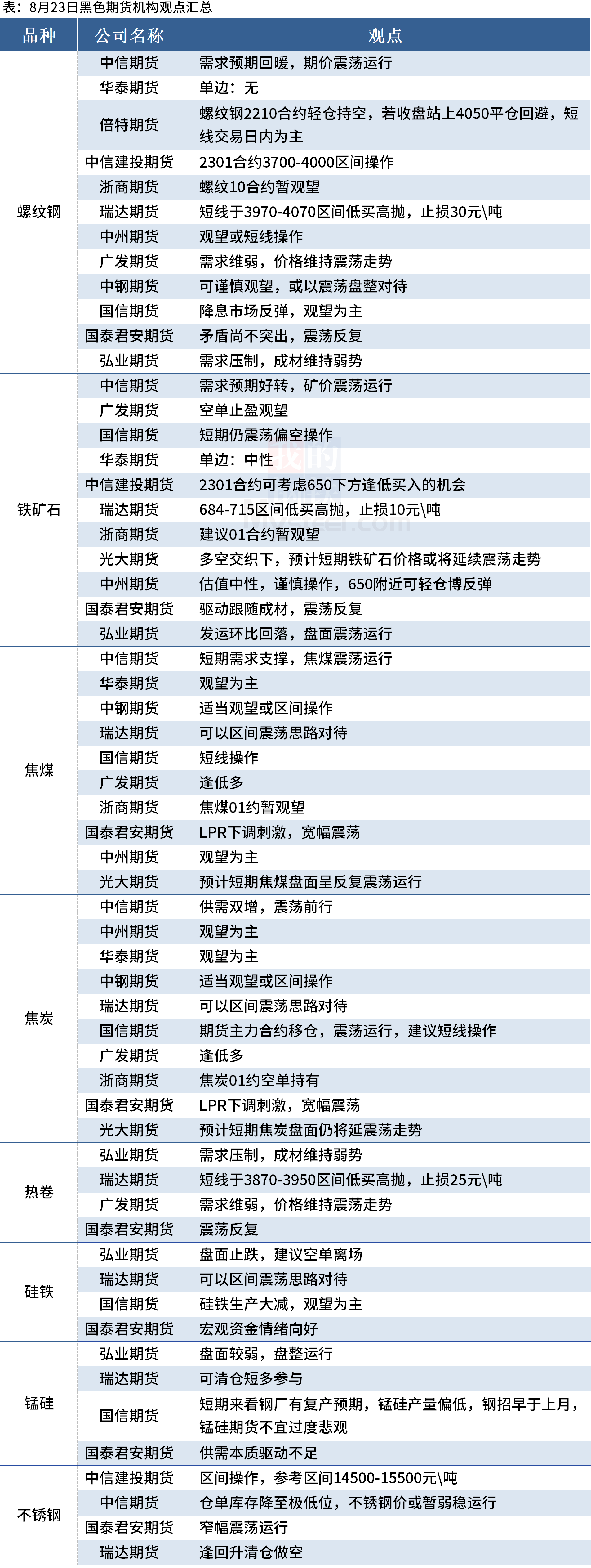 據Mysteel統計8月23日13家期貨機構操作策略,其中多數機構料螺紋鋼震蕩運行,建議鐵礦石震蕩運行,焦煤、焦炭暫觀望。具體匯總內容如下: