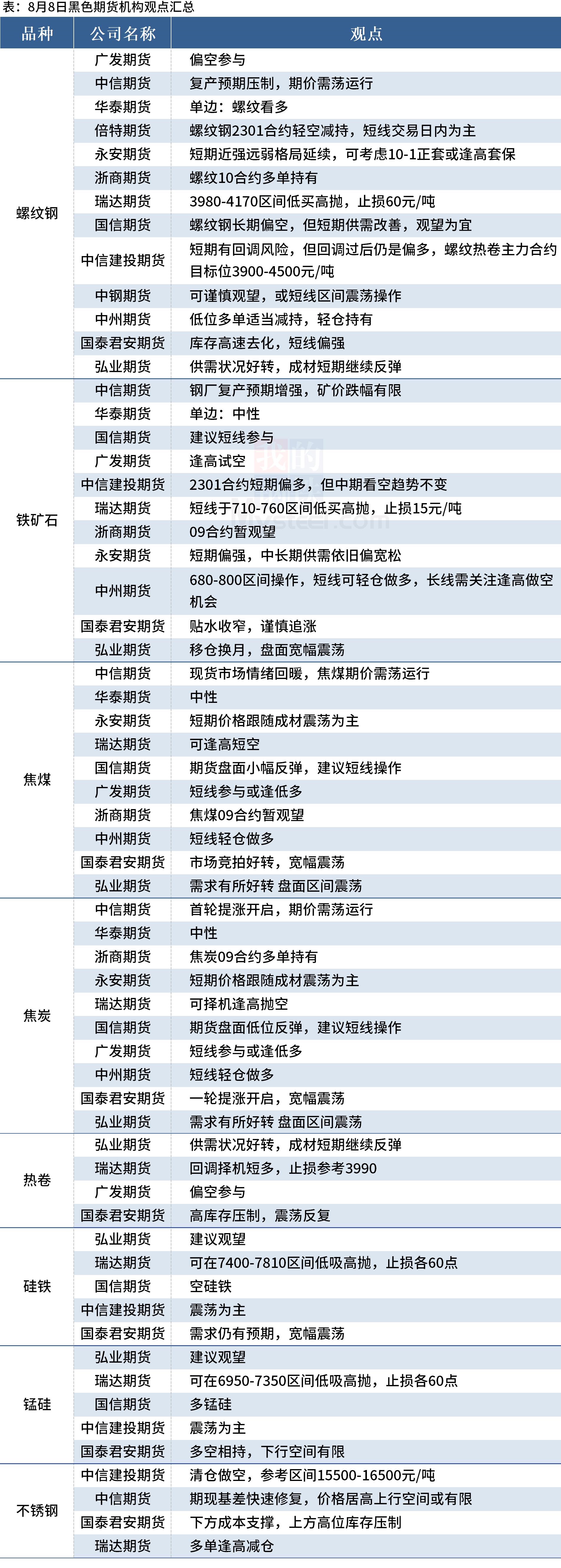 據(jù)Mysteel統(tǒng)計8月8日13家期貨機構操作策略,其中多數(shù)機構看多螺紋鋼,建議鐵礦石震蕩運行,焦煤、焦炭震蕩運行。具體匯總內(nèi)容如下: